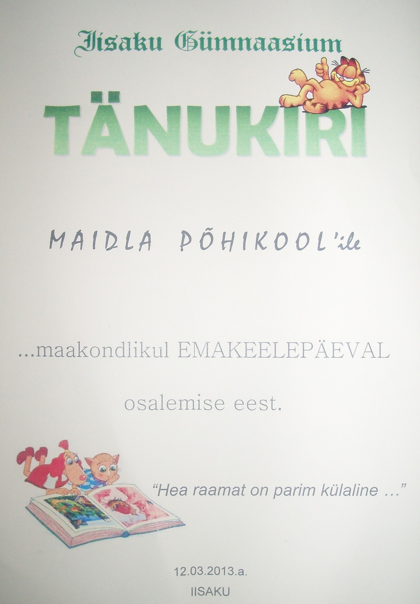 Täna (12. 03. 2013) käisime 1.-3. kl parimate emakeeleoskajatega Iisakus algklasside emakeelepäeval. Õpilased lahendasid 2 h eesti keele ja kirjandusega seotud ülesandeid nii individuaalselt kui ka grupis. Meie lapsed Marta Mariko, Pärtel, Madli Liis, Hanna Hermione olid tublid ja väärivad tunnustust ja kiitust. Kõik koolid pidid ka väikese etteastega esinema. Hommikul tegime koolis veel mitu proovi, et kõik õnnestuks.